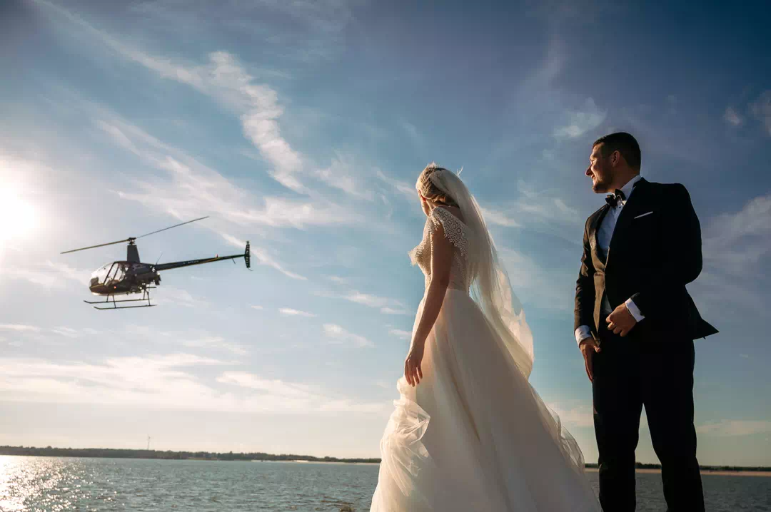 Podczas tej sesji zwrócił na nas uwagę pilot śmigłowca, który przelatywał nad zalewem w Jeziorsku. Przez pewien czas krążył wokół naszej pary i pozował do zdjęć, dodając niepowtarzalny akcent do sesji.
